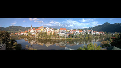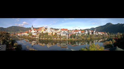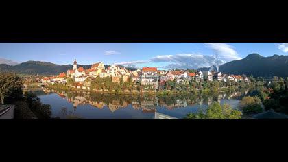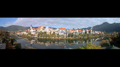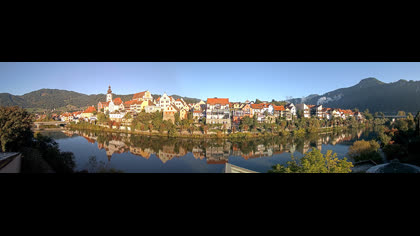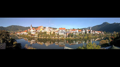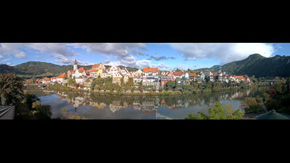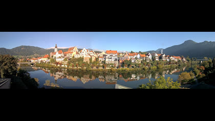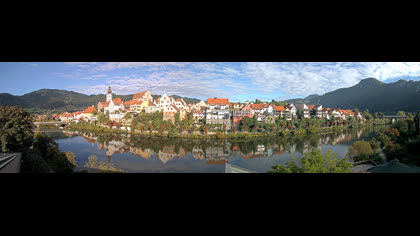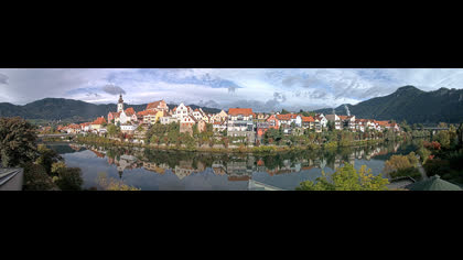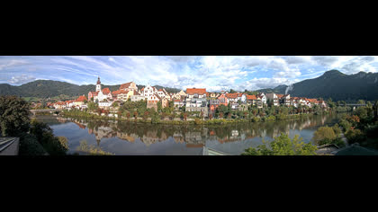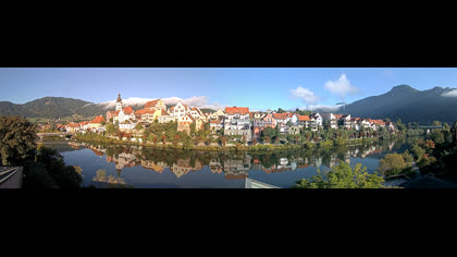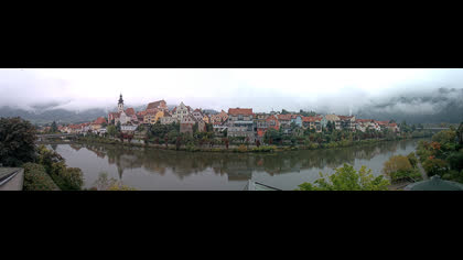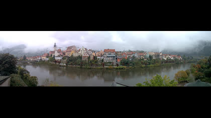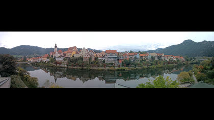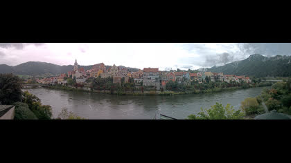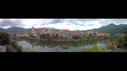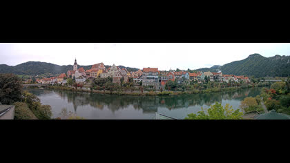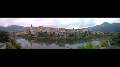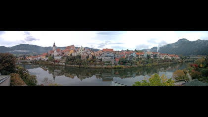 Una vista desde el restaurante Volkshaus Frohnleiten sobre el río Mura y el casco antiguo. La imagen actual de la cámara está disponible en la página web externa.