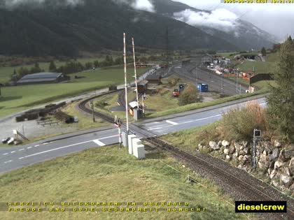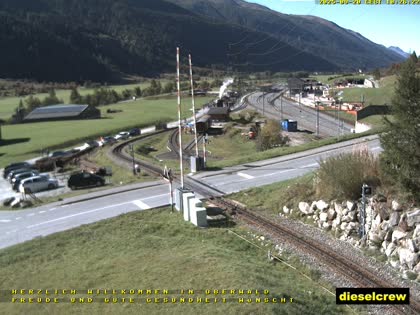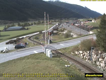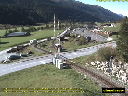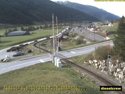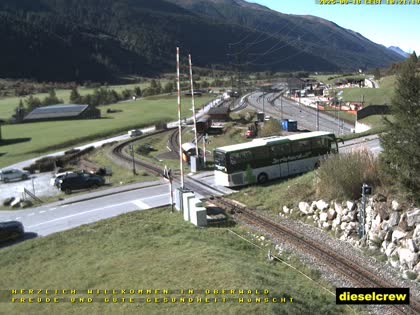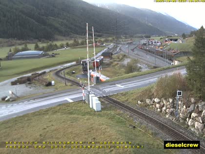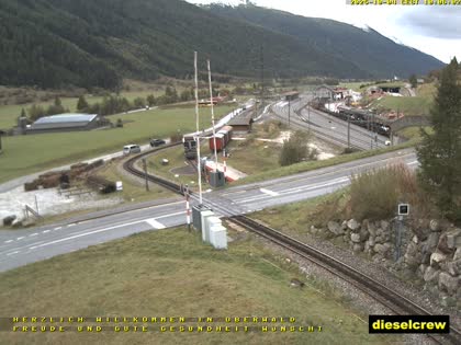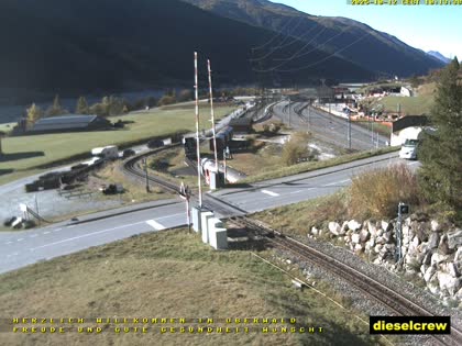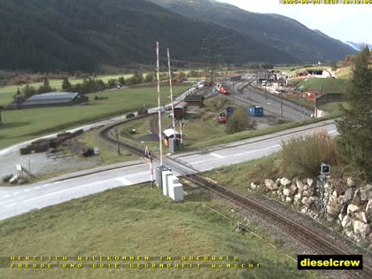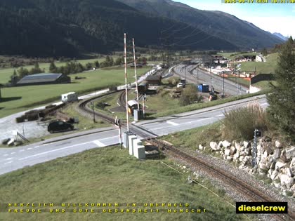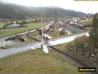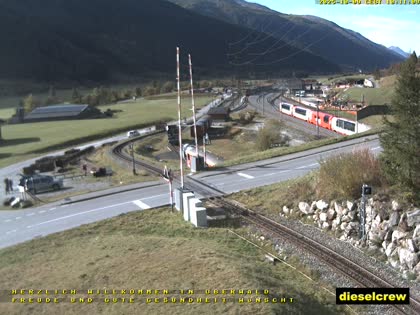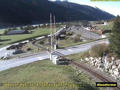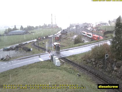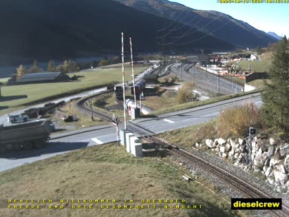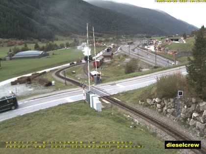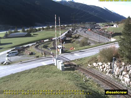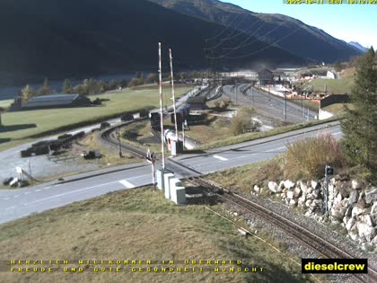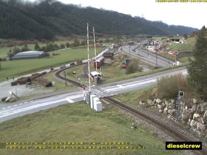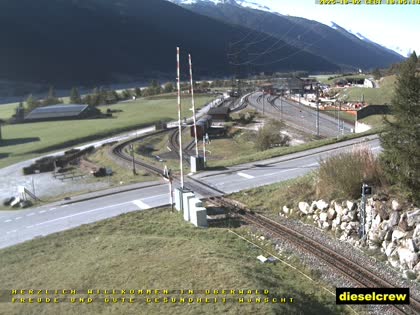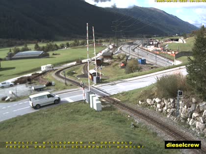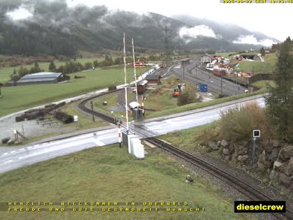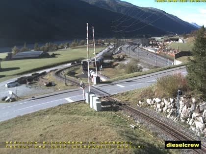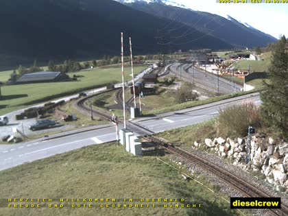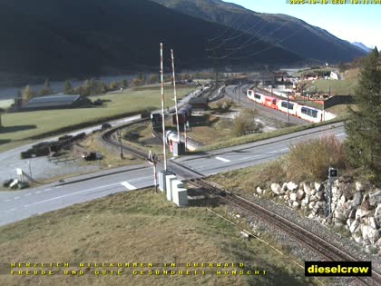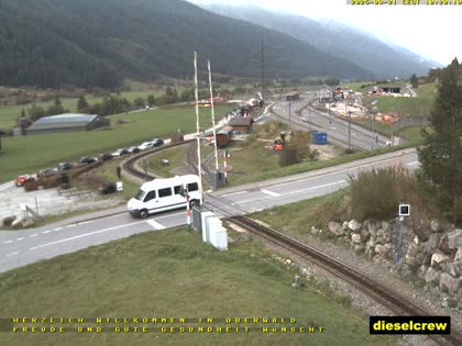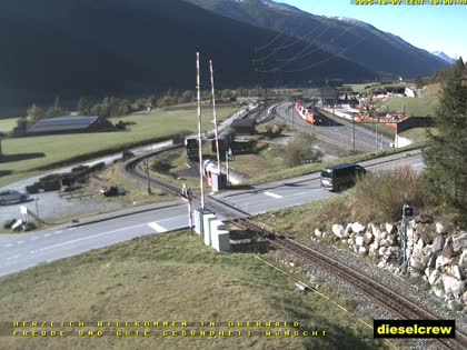 Vista del cruce ferroviario hacia la estación de tren de Oberwald. La imagen actual de la cámara está disponible en la página web externa.