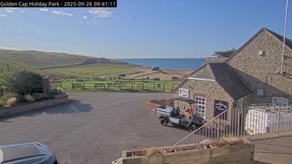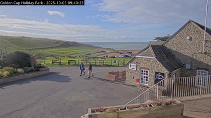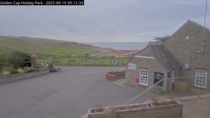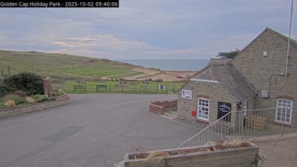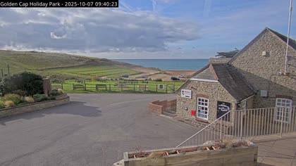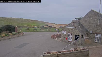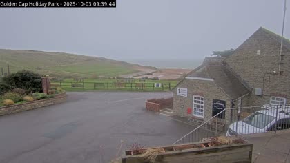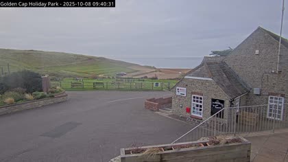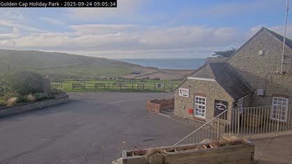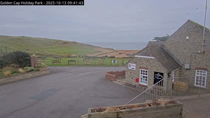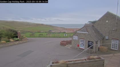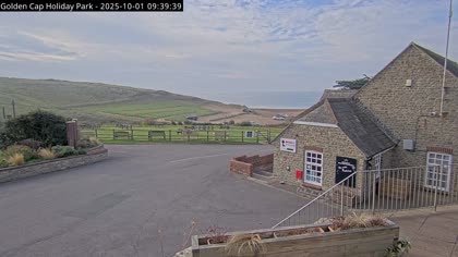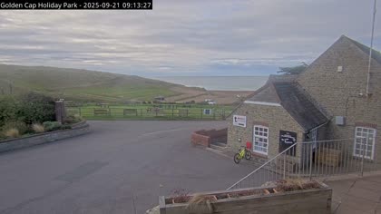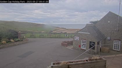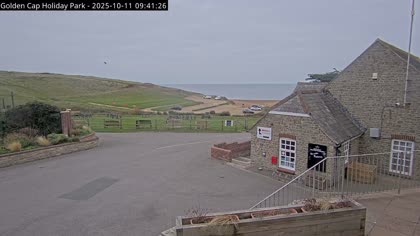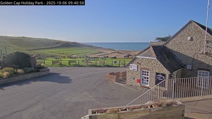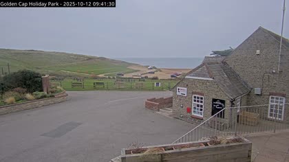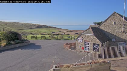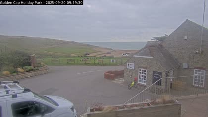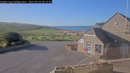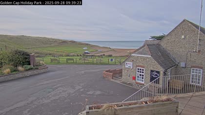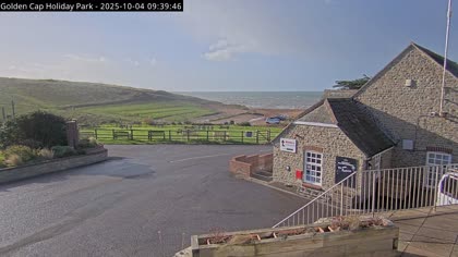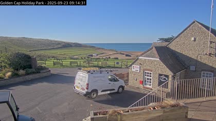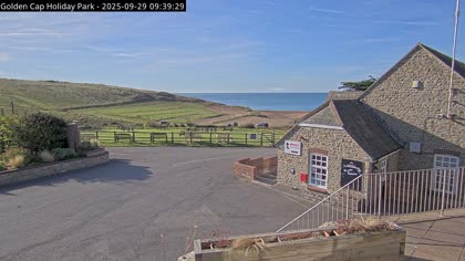 Vista desde el Golden Cap Holiday Park hacia Seatown Beach. La imagen actual de la cámara está disponible en la página web externa.